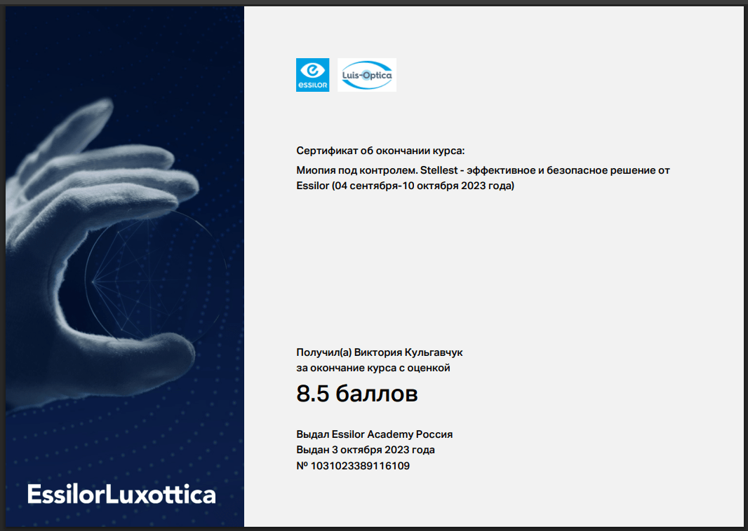 2023 — Курс «Миопия под контролем. Stellest — эффективное и безопасное решение от Essilor»;