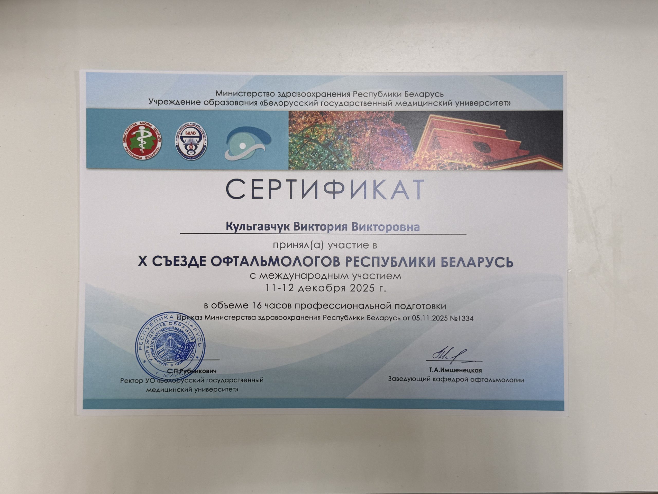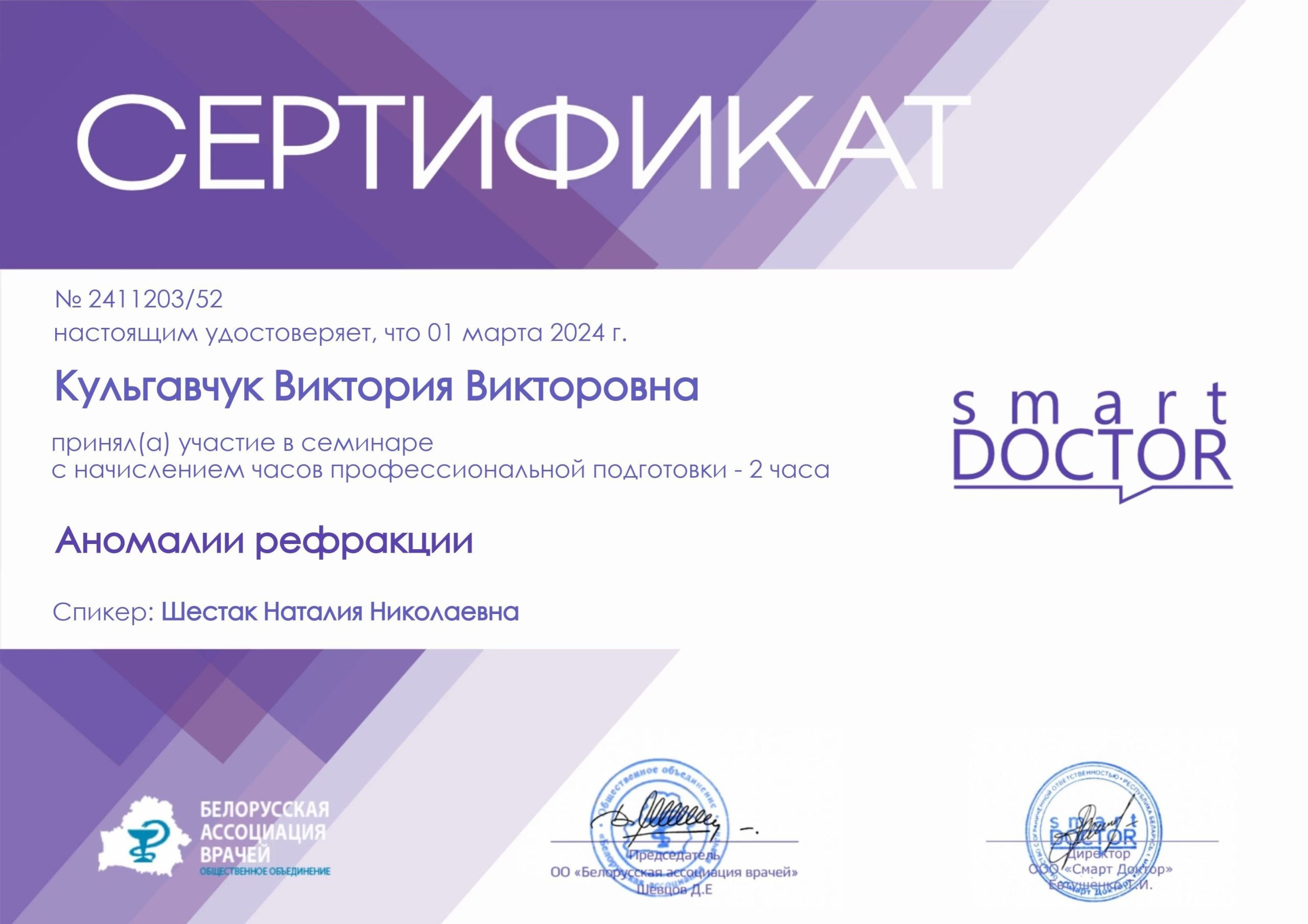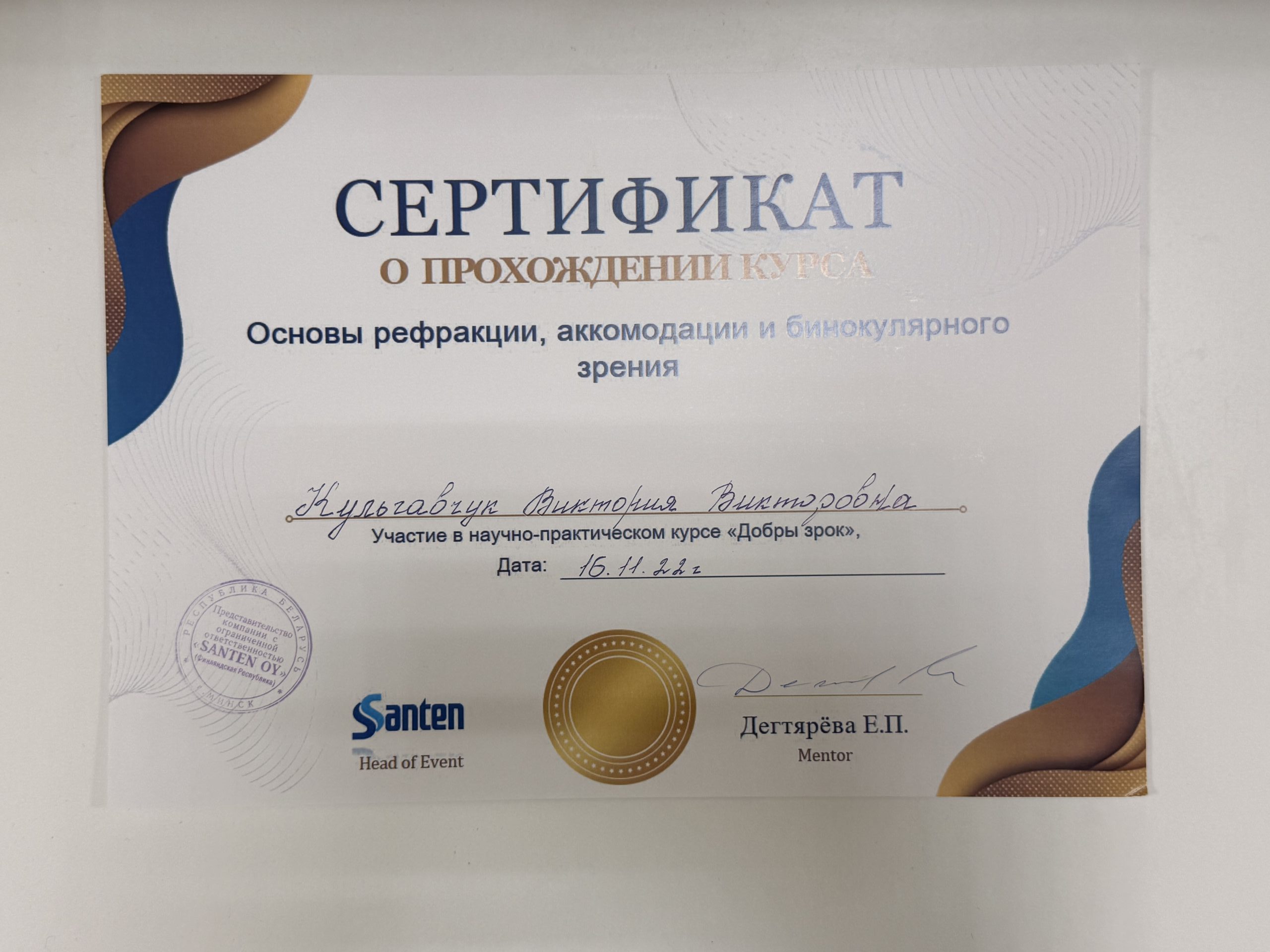 2022 — Научно-практический курс «Основы рефракции, аккомодации и бинокулярного зрения», г. Минск;