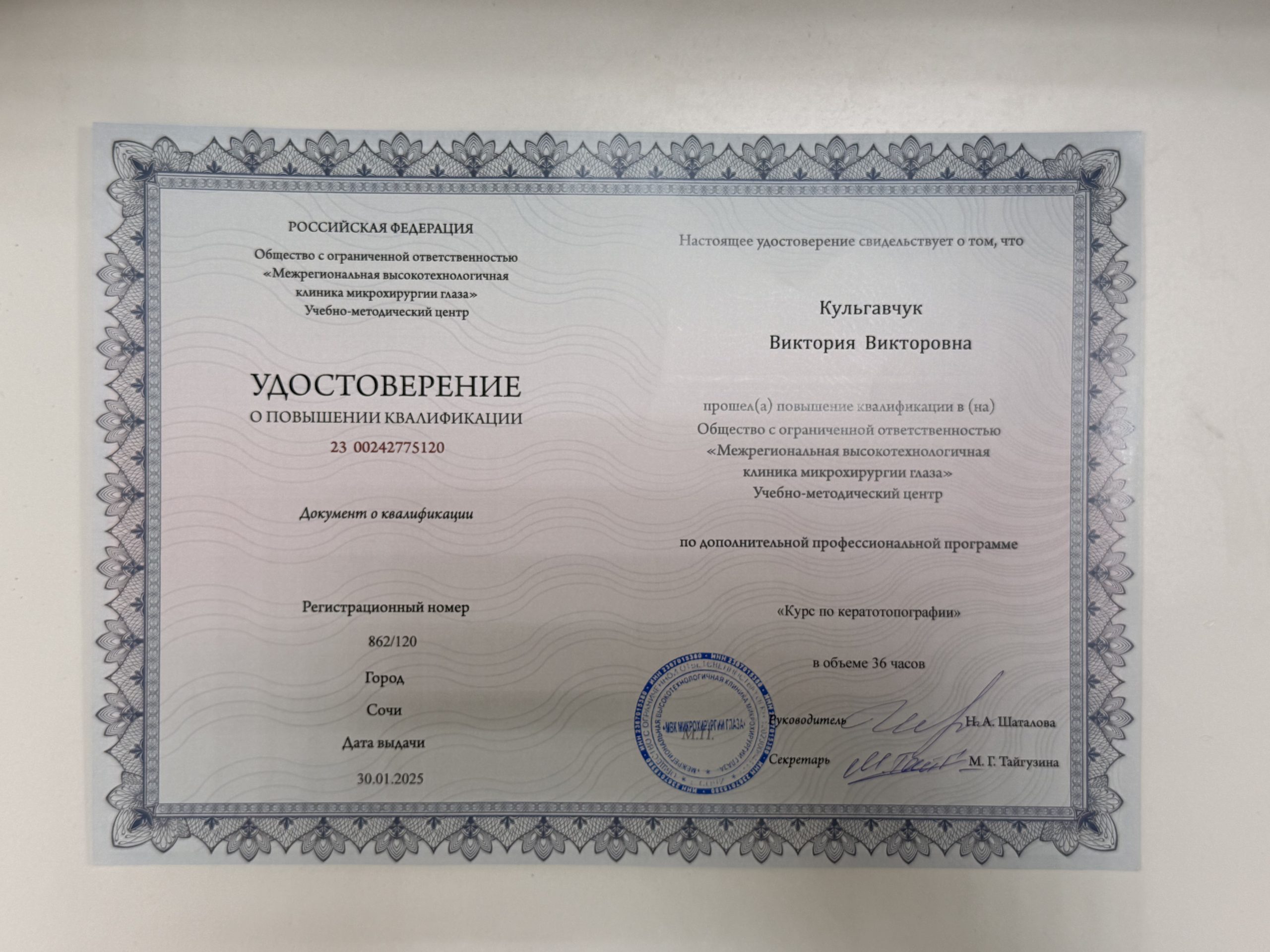 2025 — Повышение квалификации «Курс по кератотопографии», г. Сочи;