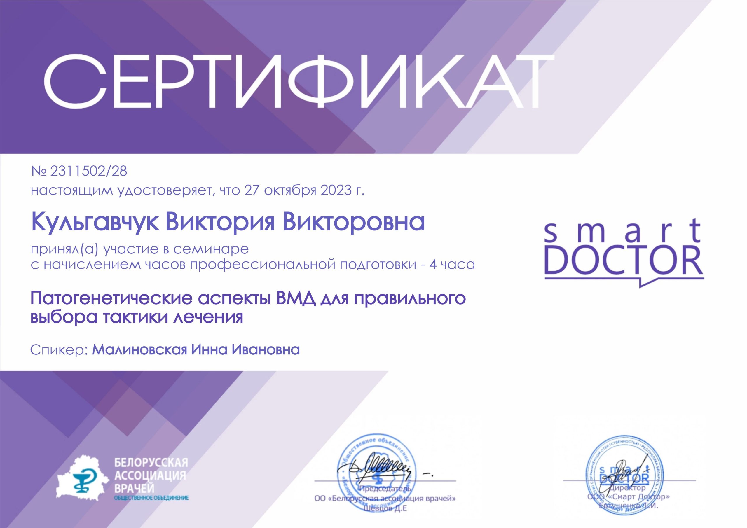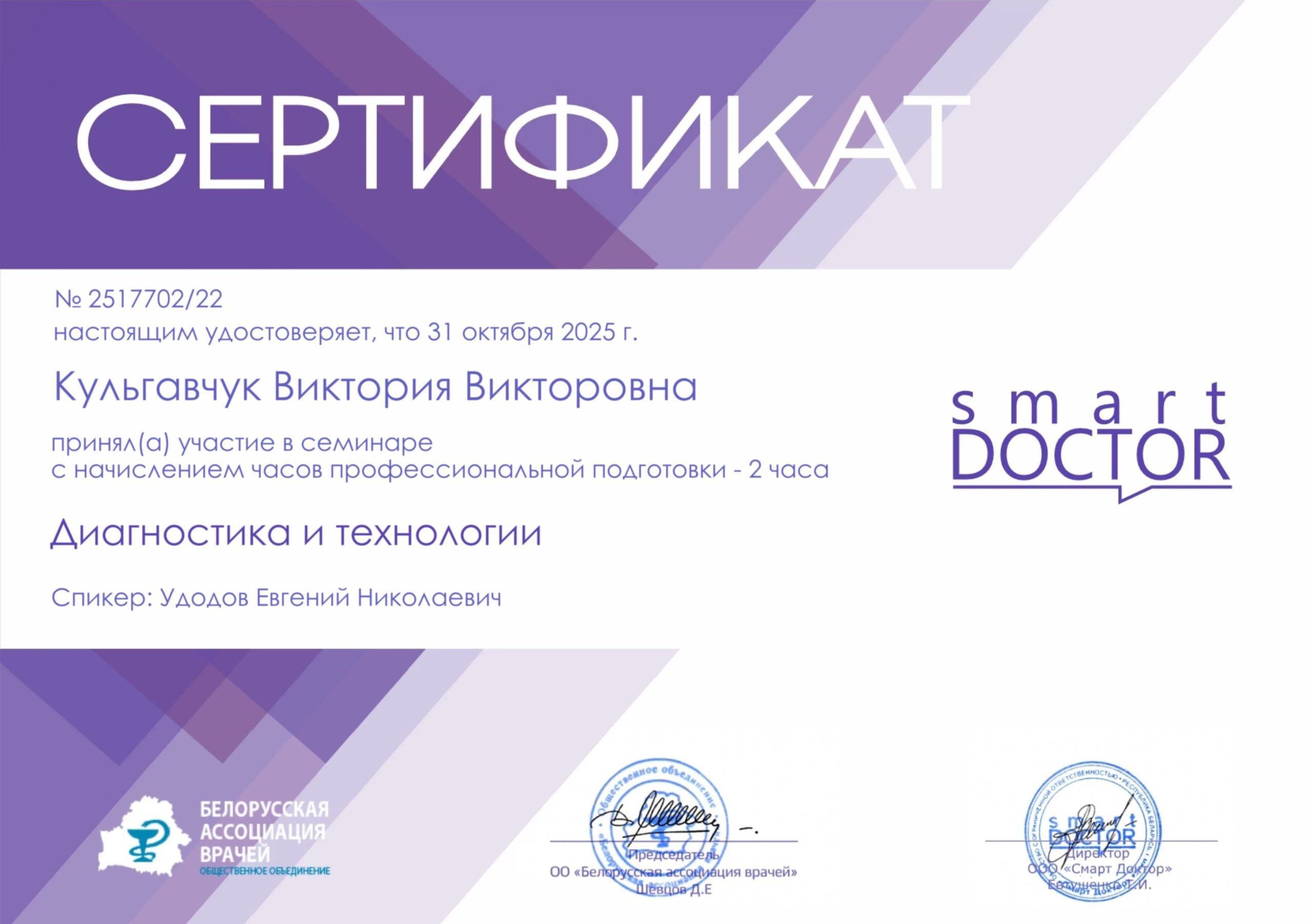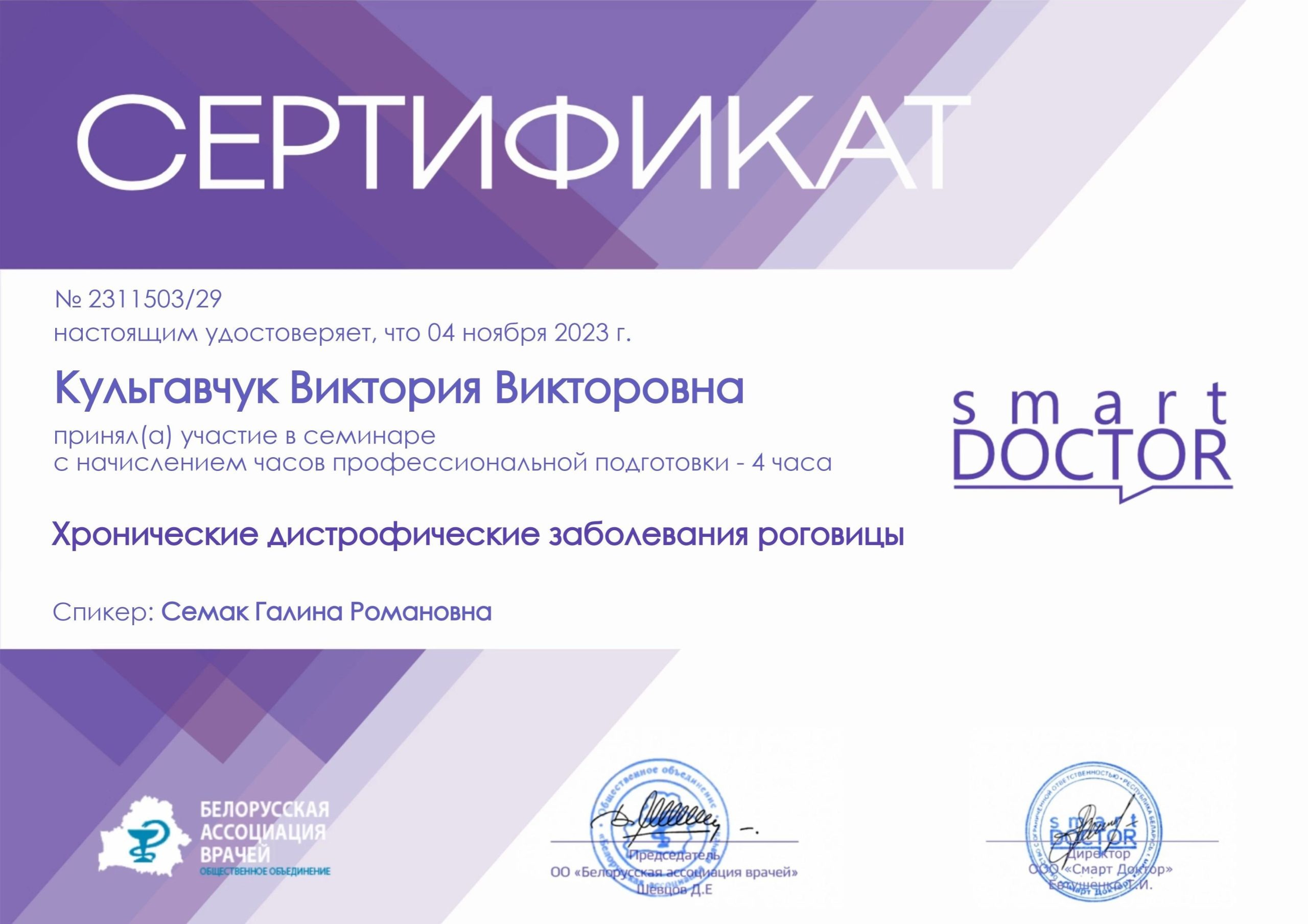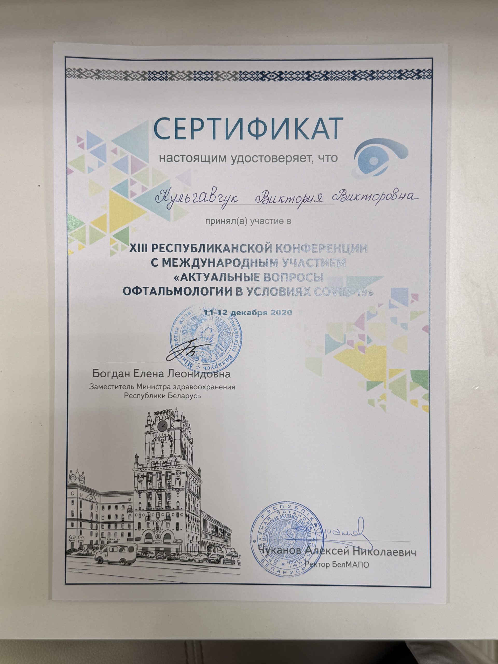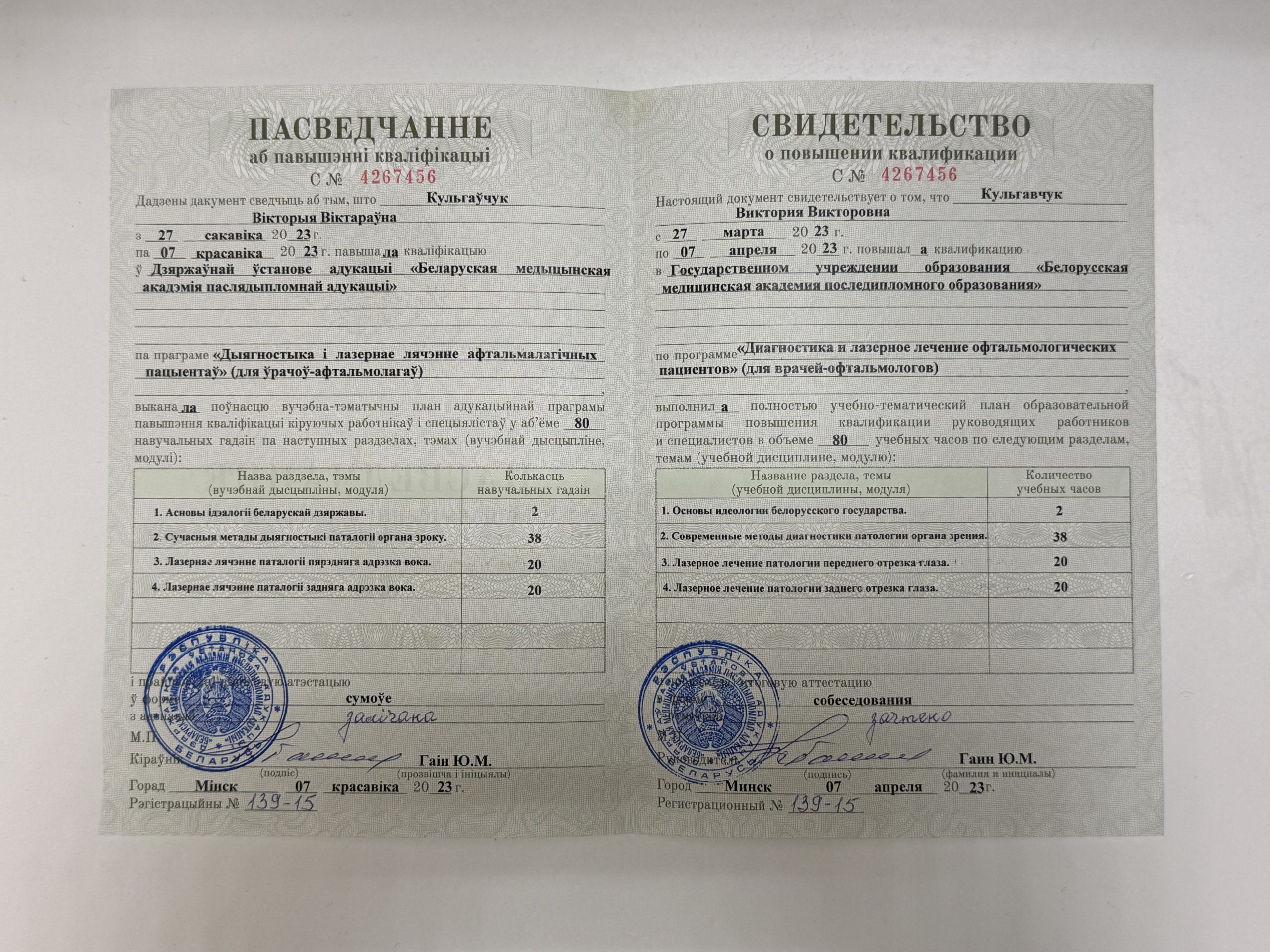 2023 — Повышение квалификации «Диагностика и лазерное лечение офтальмологических пациентов», БелМАПО;