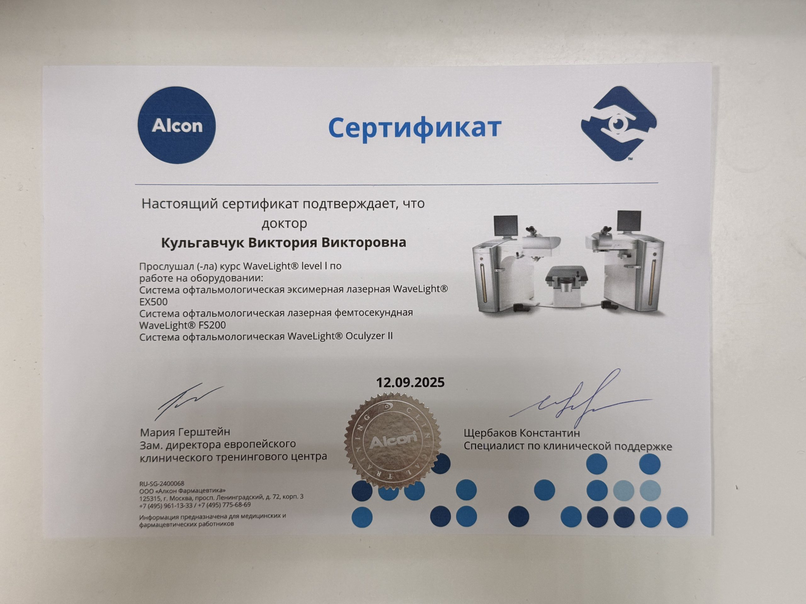 2025 — Курс WaveLight level 1 по работе на оборудовании: система офтальмологическая эксимерная лазерная WaveLight EX500, система офтальмологическая лазерная фемтосекундная WaveLight FS200, система офтальмологическая WaveLight Oculyzer II;